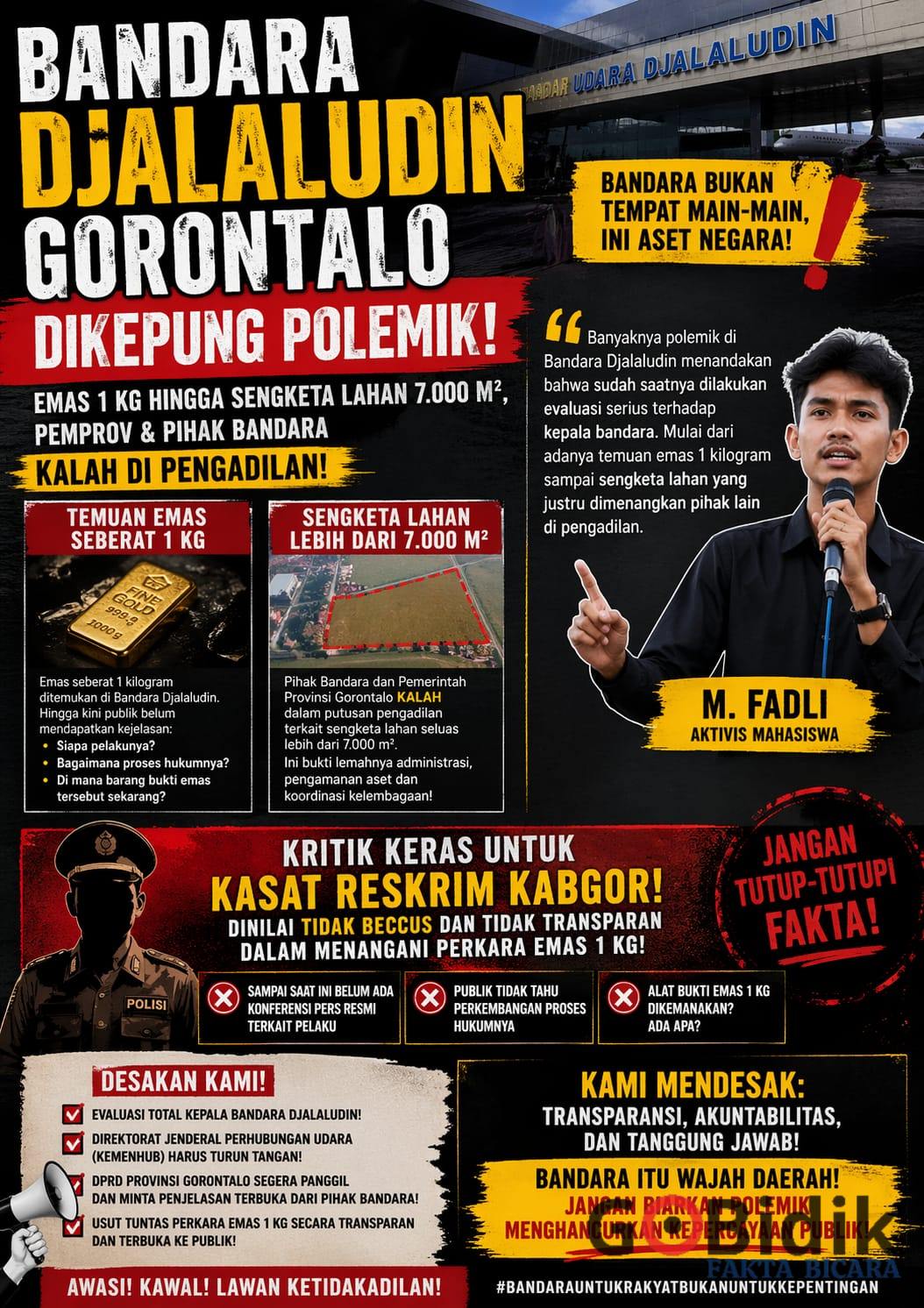 Aktivis mahasiswa Gorontalo, M. Fadli, menyebut situasi ini sebagai peringatan serius terhadap lemahnya pengawasan keamanan dan buruknya perlindungan aset negara di kawasan strategis transportasi udara.