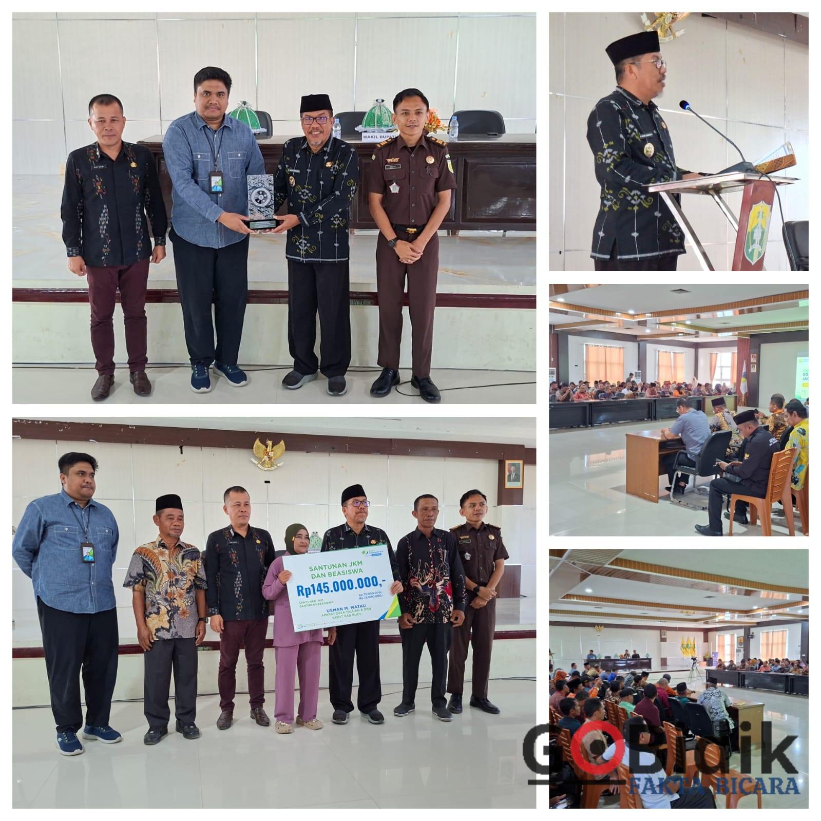 Dalam kesempatan itu, Wakil Bupati menyerahkan santunan Jaminan Kematian (JKM) serta bantuan beasiswa pendidikan kepada ahli waris penerima manfaat.